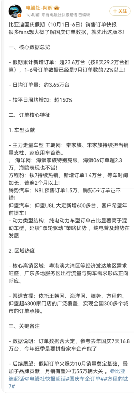 国庆黄金周刚过,比亚迪就交出了一份堪称“现象级”的订单成绩单——10月1日至6日,累计新增订单超23.6万台,若按8天假期推算,总量可达29.2万台,不仅较去年国庆7天16.8万台的成绩大幅增长,更创下“日均3.65万台”“较平日周均增长超150%”的亮眼表现。这份数据背后,既有主力车型的持续走量,也有新品牌、新车型的强势助攻,更折射出比亚迪在纯电市场的加速渗透,为其冲击10月55万辆月销目标奠定了坚实基础。